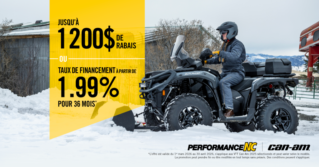 Jusqu’au 30 avril 2026, obtenez jusqu’à 1200$ de rabais OU profitez d’un taux à partir de 1,99% pour 36 mois sur les VTT 2025.