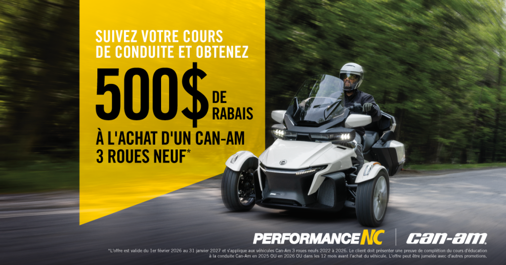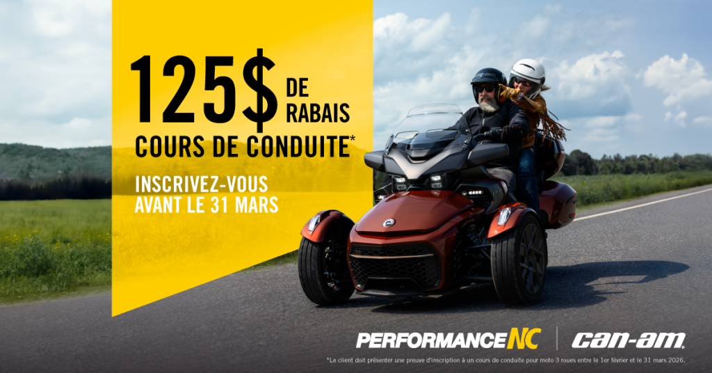 Jusqu’au 31 mars 2026, inscrivez-vous à un cours de conduite de 3 roues et obtenez 125$ de rabais sur celui-ci.