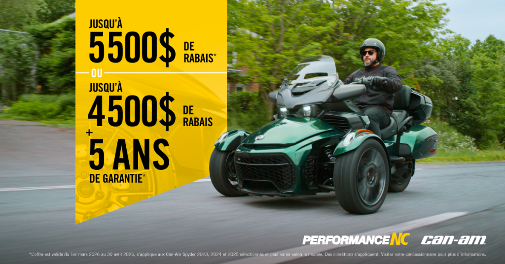 Jusqu’au 30 avril 2026, obtenez 5500$ de rabais OU 4500$ de rabais + 5 ans de garantie l’achat d’un Can-Am Spyder 2023, 2024 ou 2025