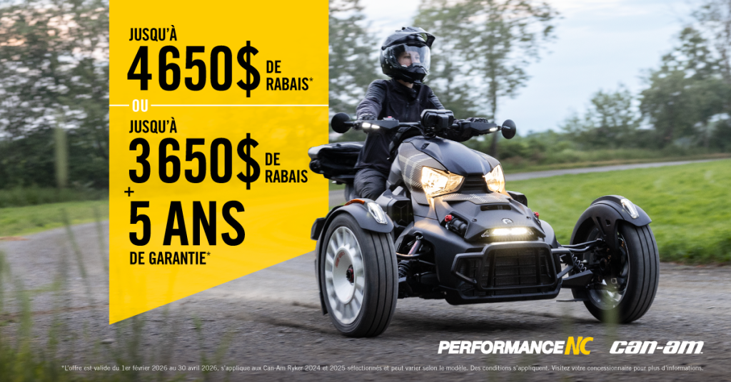 Jusqu’au 30 avril 2026, obtenez jusqu’à 4650$ de rabais OU jusqu’à 3650$ de rabais + 5 ans de garantie à l’achat d’un Ryker 2024 et 2025