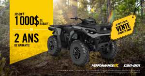 Jusqu’au 30 avril 2026, obtenez jusqu’à 1000$ de rabais OU profitez d’une garantie de 2 ans sur les VTT 2026.