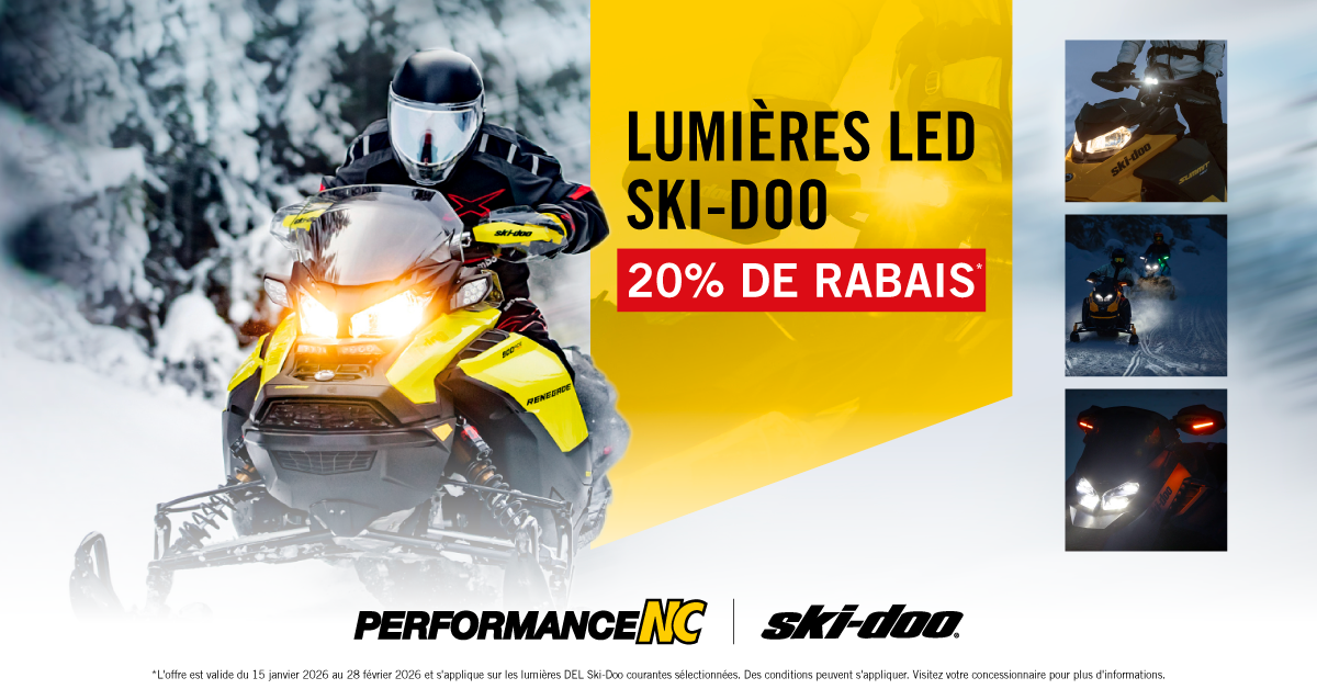 L’offre est valide du 15 janvier 2026 au 28 février 2026 et s’applique sur les lumières DEL Ski-Doo courantes sélectionnées. Des conditions peuvent s’appliquer. Visitez votre concessionnaire pour plus d’informations.