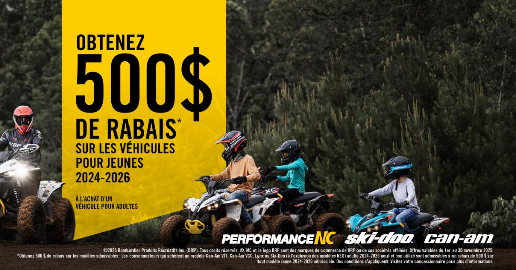 ©2025 Bombardier Produits Récréatifs inc. (BRP). Tous droits réservés. ®, MC et le logo BRP sont des marques de commerce de BRP ou de ses sociétés affiliées. Offres valables du 1er au 30 novembre 2025. *Obtenez 500 $ de rabais sur les modèles admissibles : Les consommateurs qui achètent un modèle Can-Am VTT, Can-Am VCC, Lynx ou Ski-Doo (à l’exclusion des modèles NEO) adulte 2024-2026 neuf et non utilisé sont admissibles à un rabais de 500 $ sur tout modèle Jeune 2024-2026 admissible. Des conditions s’appliquent. Visitez votre concessionnaire pour plus d’informations.