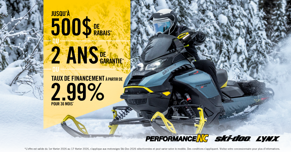 *L’offre est valide du 1er au 17 février 2026, s’applique aux motoneiges Ski-Doo/Lynx 2026 sélectionnées et peut varier selon le modèle. Des conditions s’appliquent. Visitez votre concessionnaire pour plus d’informations.