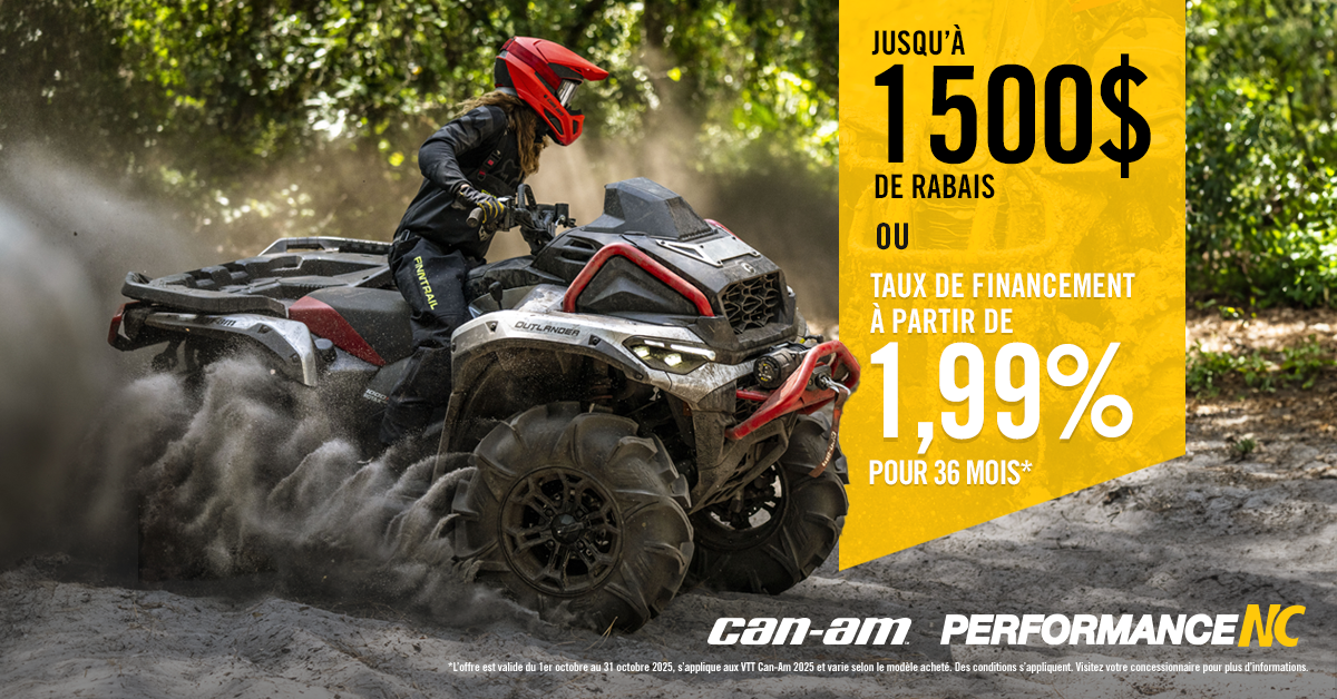 © 2025 Bombardier Produits Récréatifs inc. (BRP). Tous les droits sont réservés. ®, MC et le logo BRP sont des marques de commerce de BRP ou de ses sociétés affiliées. *L’offre est valide du 1er octobre au 31 octobre 2025, s’applique aux VTT Can-Am 2025 et varie selon le modèle acheté. Des conditions s’appliquent. Visitez votre concessionnaire pour plus d’informations.